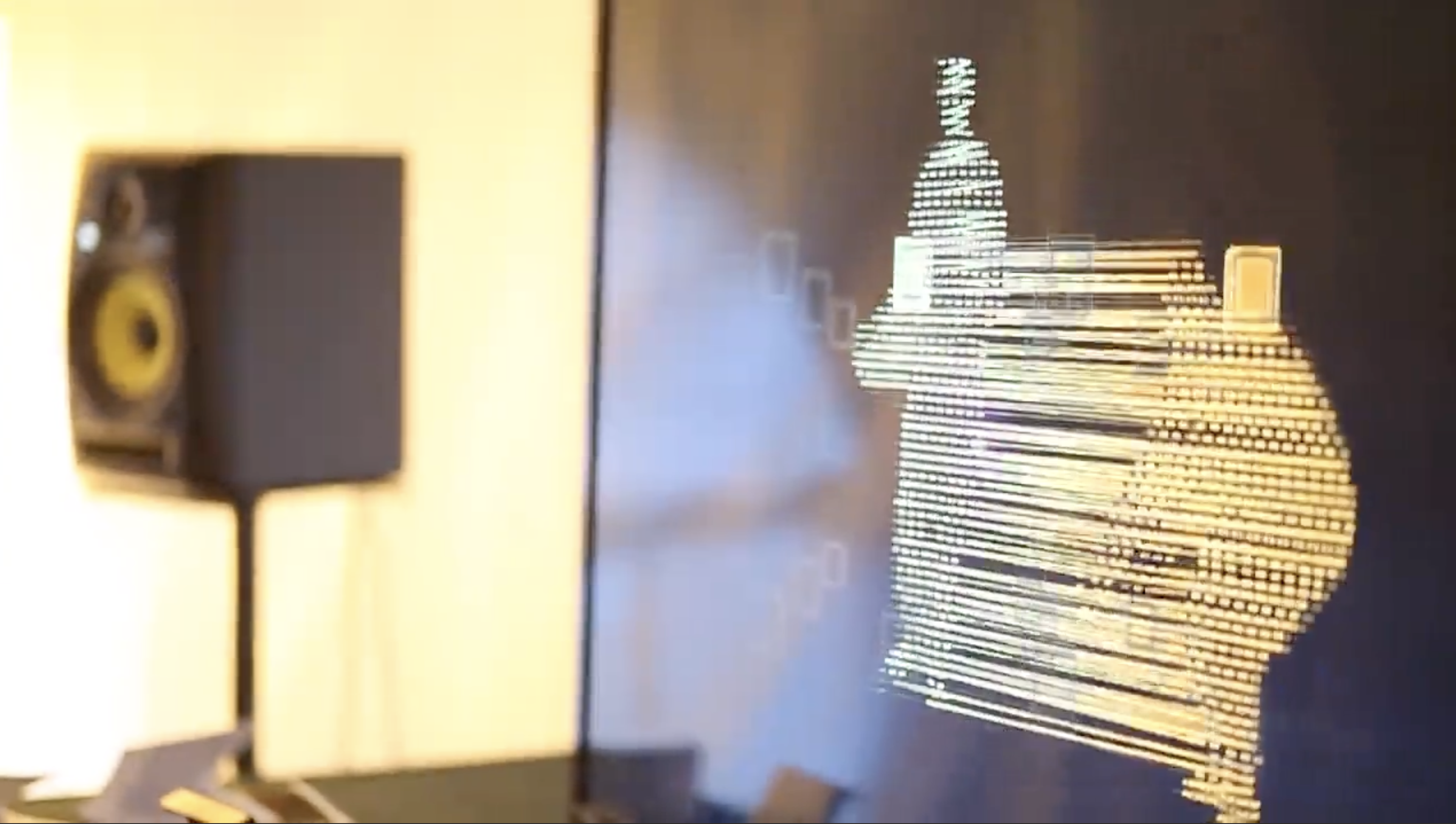 The installation presents as a mirror, until one steps into the space revealing an alternate visual with your body rendered as lines and points, a moving diagram drawn in real-time. Your movements fire invisible triggers distributed across the room, each generating sound. Multiple people play together without knowing it — each assigned their own instrument and color palette within a shared score.